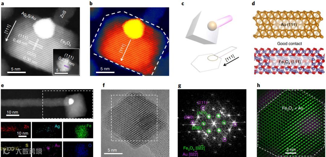 图2. 四元异质纳米棒的外延生长表征。(a-b)高分辨图像显示每种组分晶面,展示了沿立方晶体[111]轴的外延生长方向。(c)异质纳米棒的三维模型和俯视投影图。(d)晶面原子模型。(e)纳米棒组分元素分布。(f-h)纳米棒端点结构分析。