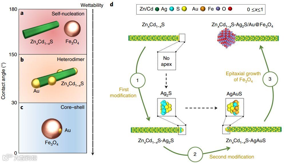 图1. 一维纳米棒的位点选择性磁化。(a-c)异质成核生长与两种材料间接触角的关系总结。(d)“双缓冲层”策略实现磁性组分在纳米棒端点的选择性生长。