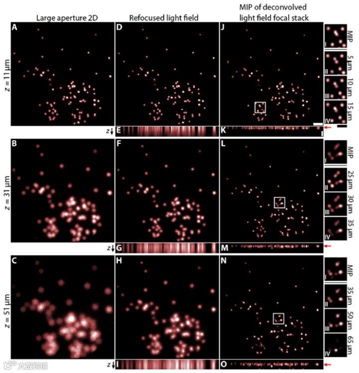 光场中包含的视差可用于重新聚焦场景的图像。我们通过成像随机分布在玻璃片上的荧光珠的集合来证明这种能力(图3)。传统的大口径2D光纤图像(图3 A-C)的分辨率使用标准的“移相加”光场重聚焦技术(图3 D-I)得到增强,并使用3D反卷积进一步完善技术(图3 J-O)。 如图3 E,G,I(重新聚焦的光场焦点堆栈),图3 K,M,O中的xz平面最大强度投影(MIP)所示,焦距堆栈反褶积还显着增加了轴向定位(反卷积光场焦点堆栈)。
