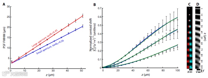 通过将该系统的PSF建模为宽度与最大光线收集角直接相关的2D高斯分布。通过数字NA滤波计算其LMI方程,可以得到光场矩矢量的平移。将2D高斯拟合到一系列深度的大小NA孤立光源的图像上,可得到两最大光线收集角(图2 A)。图2 B显示了在距纤维刻面1至101微米处实验测量的荧光光源的C矢量值,以及仿真和理论结果。模拟和理论都与实验数据非常吻合。
