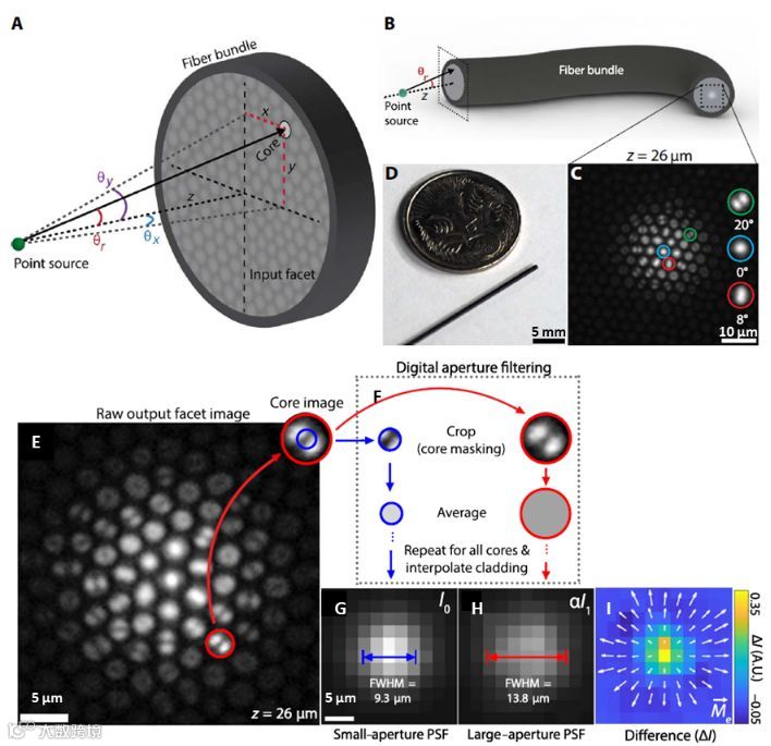 当通过光纤束对一个理想荧光点光源进行成像时(图1 A,B),在轴向距离26 µm处的原始输出图像如图1 C所示,其径向对称源于模式耦合效率与入射光角度的直接相关。而在典型操作中,其角度信息会由于以去像素化为目的的下采样而丢失。由于高阶模式会在大入射角时激发,通过选择性去除芯层边缘的光场,即数字数值孔径滤波技术,我们可以实现合成式压缩的数值孔径(图1 G,H)。