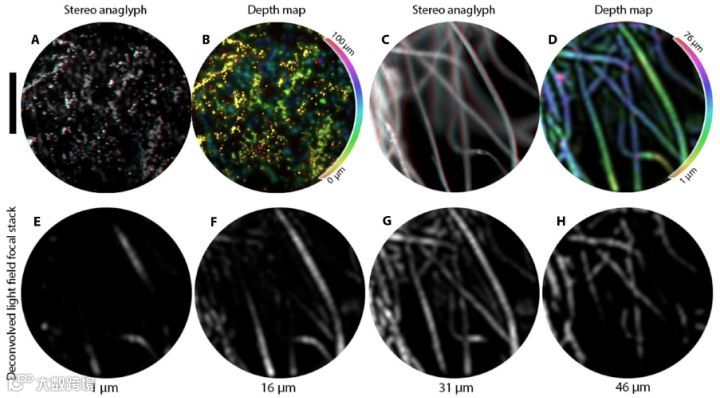 场景的3D结构可以通过立体图像和透视移动动画直接观察。对两个3D样品成像,PDMS中的荧光珠(图4 A,B)和带有荧光荧光笔的晶状体组织(图4 C,D)。图4 A,C显示了由完全相反的水平视点组成的红蓝立体图像。如图2 C中所示,视差表现为红色和青色图像中的结构之间的横向位移,从而在佩戴红色-青色眼镜时产生3D图像。尽管这些立体图仅使用两个视点,但光场包含沿任意方向具有视差的场景图像。使用该视点信息以及最小二乘深度映射方法来创建图4 B所示的深度图,其中深度由色调指示。或者,我们通过反卷积光场焦点堆栈的MIP构造图4 D中的深度图。色相对应于最大强度的深度。图4 C,D中的深度结构可以通过图5 E-H中所示的去卷积光场焦点堆栈的选定切片可视化。