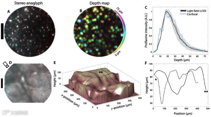 光场成像方法也可以访问表面形貌。为了证明这种能力,对靠近指关节的拇指背面的皮肤自发荧光成像。在图5 D的红青色立体图中很容易看到3D皮肤褶皱的微观结构。图5 E,F中的表面形貌是通过聚焦算法的简单形状计算得到的,其中聚焦度量是在光场焦点堆栈的每个切片的每个像素处计算的。包含最大焦点度量值的焦点位置会产生图像中给定位置的表面高度。