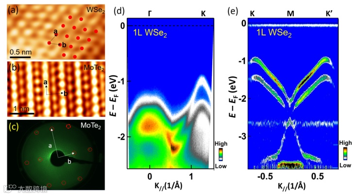 图4. 在大面积的单层样品上获得的原子图像、低能电子衍射斑点及能带结构图。