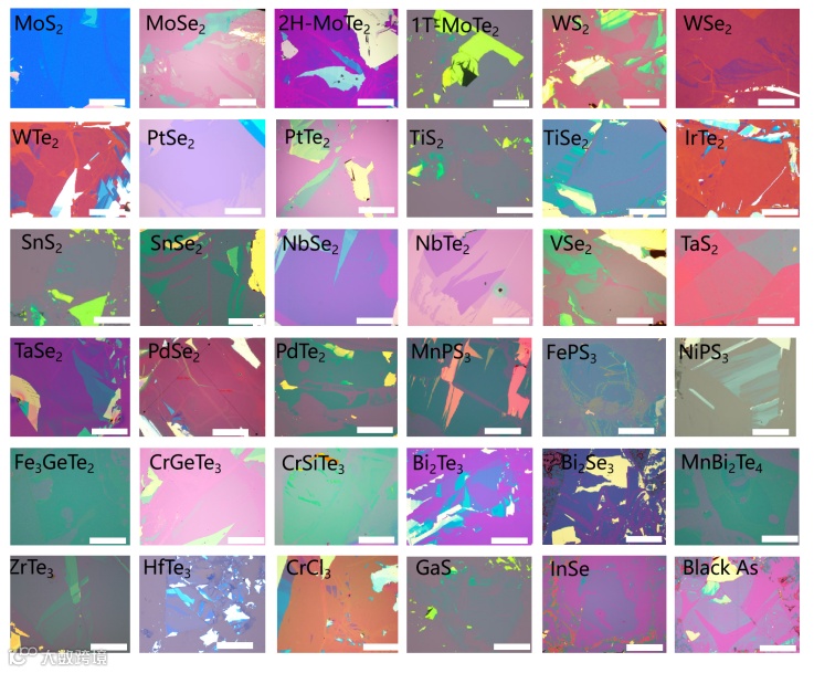 中国人民大学博士研究生潘宇浩系统地计算了58种层状材料体系与金(111)表面的相互作用 (图1),结合元素周期表中不同元素的相互作用规律,指出层状材料的最外层元素和基底的相互作用是影响机械机理最关键的因素。针对最外层元素含有VA,VIA,VIIA主族的层状材料,可以采用金膜辅助的解理方法。中科院物理所黄元副研究员和杨蓉副研究员在实验上成功实现了对40种二维材料的大面积解理,单层二维材料尺寸在毫米量级以上(图2和图3),充分验证了理论计算结果并检验了这种机械解理技术的普适性。