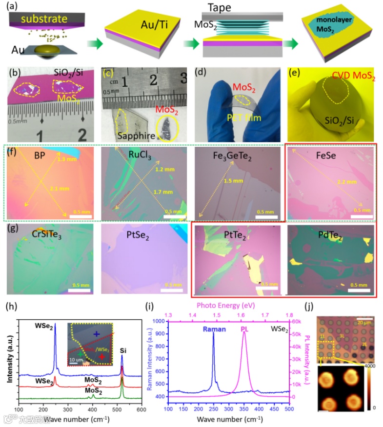 图2. 机械解理获得多种大面积高质量超薄二维材料。(a) 新型机械解理的步骤; (b-e) 不同基底上解理得到的大面积MoS2; (f-g) 解理得到的多种大面积二维材料; (h-j) 异质结及悬空二维材料的拉曼光谱及荧光光谱。