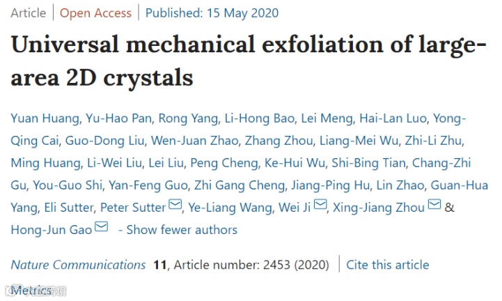 Huang Y, et al. Universal mechanical exfoliation of large-area 2D crystals. Nature Communications. 2002.