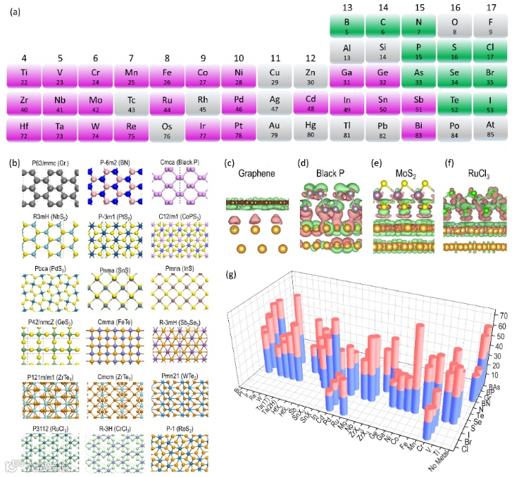 1,通过理论计算得到了金元素与58种层状材料的结合能,指出了层状材料单层中的最外层元素是影响解理过程的关键;