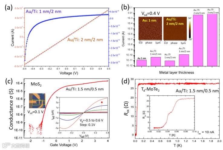 图5. 通过控制金属膜的厚度,可以获得绝缘的金属膜,可以在器件中实现高开关比和超导特性测量。