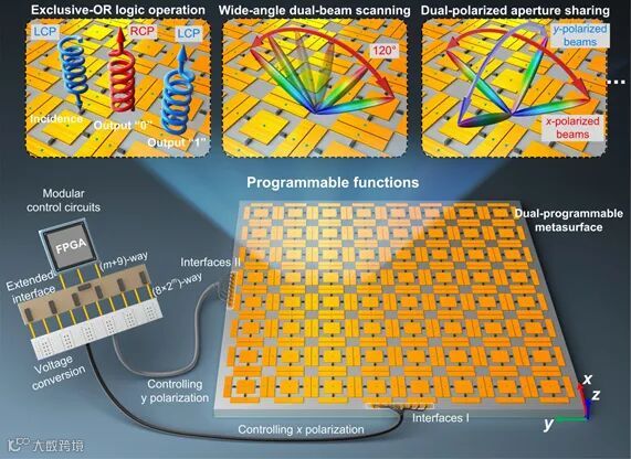 近日,东南大学崔铁军院士研究团队和新加坡国立大学仇成伟教授合作,提出、设计并实验验证了一种具有强重构能力、双通道独立可编程超表面。该双可编程超表面具有独立控制接口,能够实时对x极化和y极化电磁波进行独立编程调控,从而可实现多个复杂和新奇的电磁功能。相比于以往的单极化可编程超表面,该双可编程超表面能并行提供两个相互独立的信息传输通道,进而大大提升可编程超表面的信息处理能力。