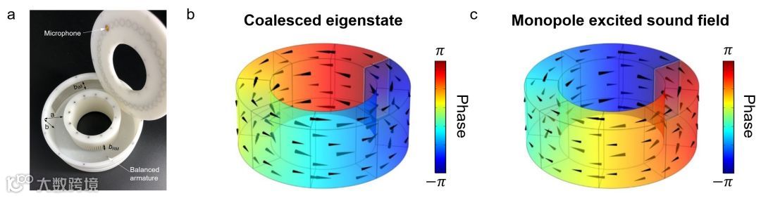 图3 (a)具有宇称-时间对称折射率分布的声学环形谐振腔样品。(b)和(c)奇异点处的腔体内部声场的相位及声能流方向。(b)为本征态,(c)为单极子激发声场。黑色箭头代表声能流方向