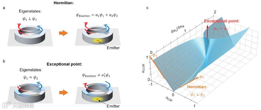 图1(a)普通环形谐振腔在一共振频率下有两个正交的本征态,处于共振频率的光源与其相互作用会同时激发出这两个本征态。(b)处于奇异点,共振频率上只存在一个逆时针传播本征态的环形谐振腔。处于共振频率的光源与其相互作用激发出了体系中不存在的顺时针传播的本征态。(c)环形谐振腔中本征态随着时间-宇称对称折射率调制的演化。在奇异点处两个本征态是完全平行的。