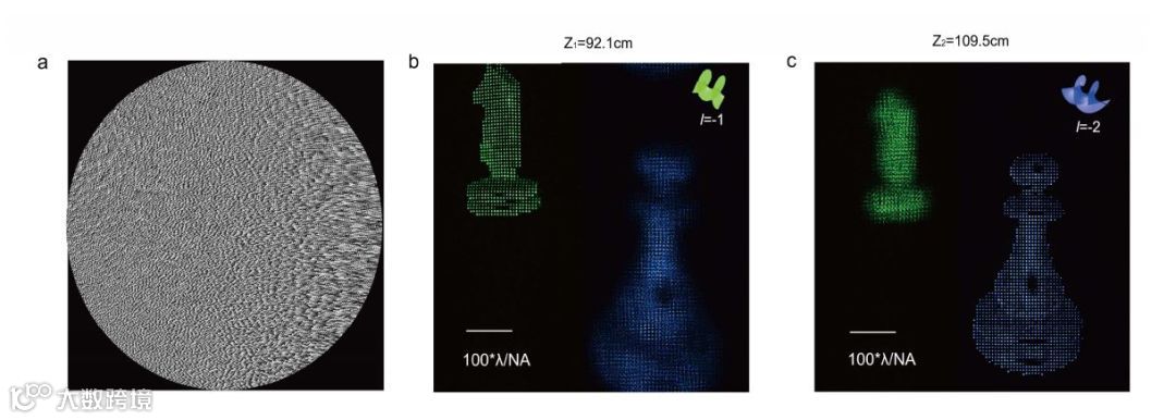 a)OAM多路复用全息图 b) 重构距离92.1cm螺旋模指数-1的重构全息图像 c)重构距离109.5螺旋模指数-2的重构全息图像