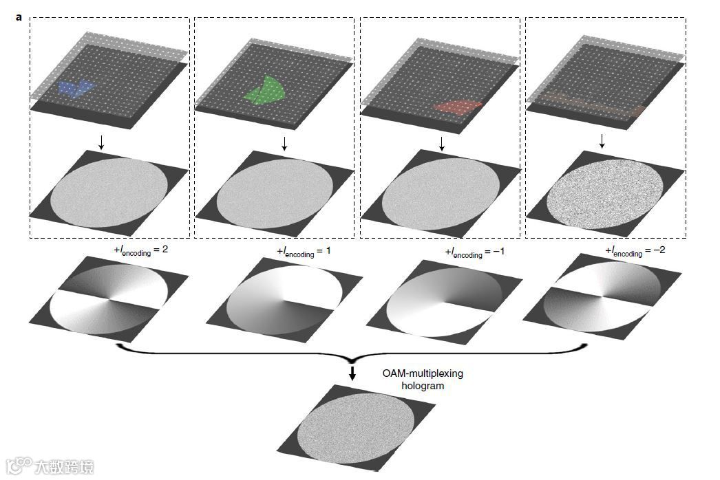 基于上述OAM选择性,顾敏课题组实现了对独立OAM信息通道进行多路复用显示的全息编码。其原理如下图所示