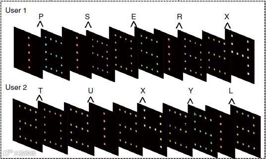 作为示例,使用阿拉伯数字的两位数字从01到26分别表示从A到Z的字母。因此,多路复用全息图可以加密5个字母。现在收到了秘钥(40,-20、40,-50、50,-10、40,-40、30、10)和秘钥(30、50、30、40、30、10、30,-10、40、30)。根据秘钥提示,分别用具有对应螺旋模指数的OAM光照射多路复用全息图,得到了如下信息: