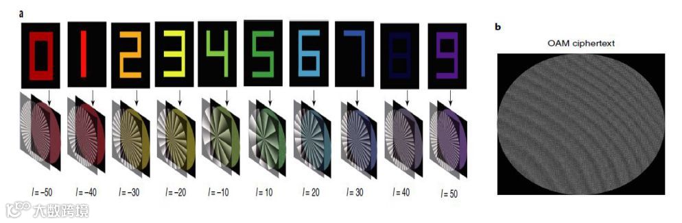高阶OAM光束可以实现安全性前所未有的全光全息加密。本研究利用螺旋模指数范围从-50到50分别对十个阿拉伯数字0到9进行编码,从而得到10位OAM多路复用全息图。
