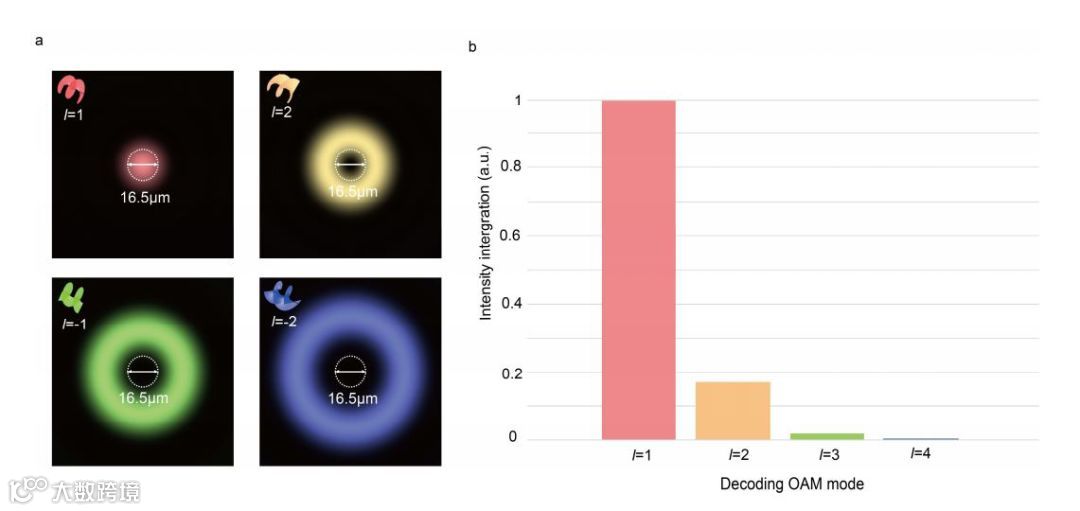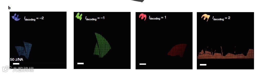 在傅立叶空间中,具有不同螺旋模指数的OAM光束表示为不同的空间频率分布,螺旋模指数越大则形成的光圈越大。顾敏团队利用这一特性,将阵列周期设计为与入射OAM光束空间频率分布相等,并由此对特定的样本阵列进行采样编码,螺旋模指数越大,采样点间隔越大。这使得不同的OAM模式具有不同的采样周期,从而实现了对OAM进行调制的数字全息图像。