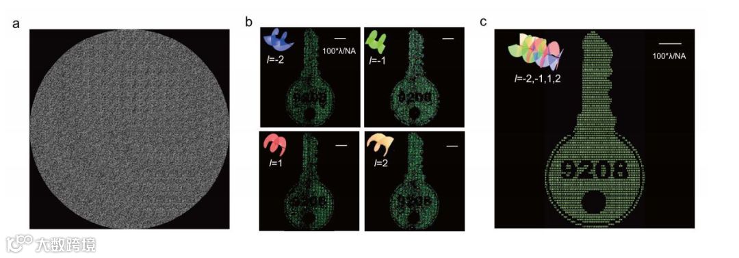 a)多路复用全息图 b) 分别使用螺旋模指数-2、-1、1、2的解码光束的重建图像。 c) 四个解码光束同时重建的完整重建图像