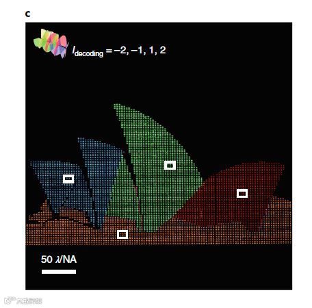 将悉尼歌剧院的图像分为四个独立的部分,对每个部分编码螺旋相位板,生成OAM多路复用全息图。入射的OAM光束可以从OAM多路复用全息图重建出不同的全息图像。结果,分别使用螺旋模数为-2、-1、1、2的入射OAM光束重构了歌剧院的四个单独的部分。