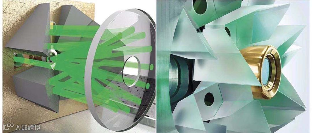 左:碟片激光头示意图,泵浦光束在碟片上多次反射。