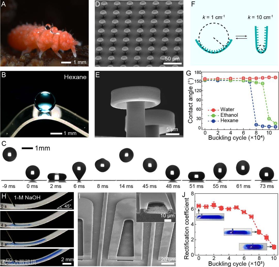 弹性裂缝工艺具备广泛的材料兼容性,使得科学家能够选择更优的基材,使得仿生能够接近甚至超越自然。比如,将蘑菇头双倒檐阵列转印在聚合物材料表面,可以轻易实现透明、柔性、高可靠性的超双疏表面。另一个典型的例子是柔性流体二极管,腐蚀液(如1-M氢氧化钠浓溶液)可以沿着复杂形貌反重力自发爬坡。经历7,000次弯折测试后,柔性二极管的流体校正系数(rectification coefficient)并无明显降低。
