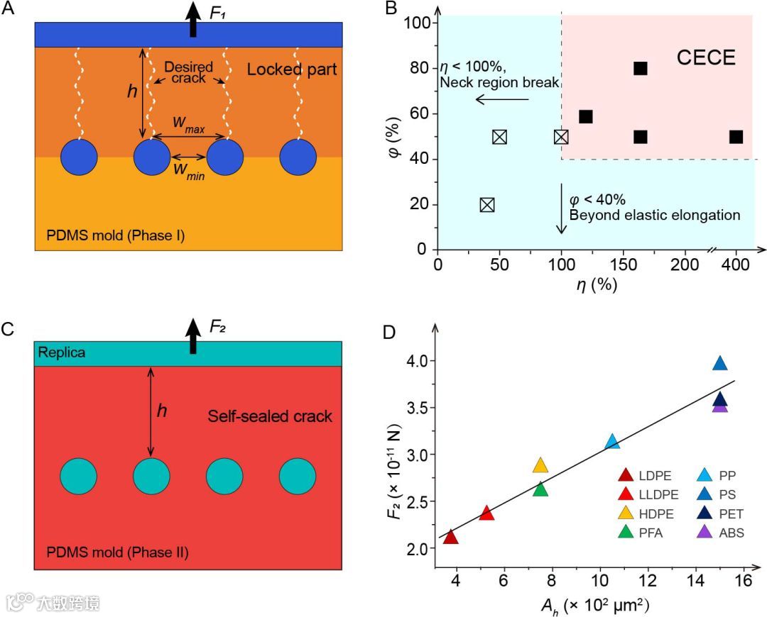 研究人员进一步建立模型,经过充分实验验证和理论模拟,发现合理的裂缝系数(η)和形变系数(φ)即可确保弹性裂缝的大面积可控生成(注:η 和φ为自定义系数,η = Wmin/h, φ=Wmin/Wmax,如下图所示);同时,裂缝在一定作用力下可保持稳定闭合,而这一临界值和裂缝面积大小线性相关。上述机理研究,为弹性裂缝工艺中结构设计和材料选择提供了充足的理论依据。