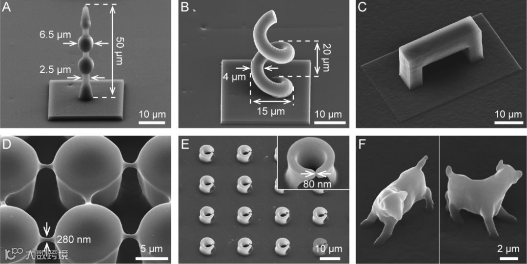 研究人员设计了一系列三维层级结构结构,如串珠状探针,立体螺旋结构,拱桥,纳米梁阵列,悬臂开口环阵列,以及纳米小牛。可别小看了这些结构,他们在新近出现的各种重要领域大显神通,如光镊,超材料,中红外电磁共振,生物支架,微流控,等离子体激元,光子晶体等世界研究前沿和热点。在此之前,此类结构都只能用最先进的MEMS工艺和高精度3D打印技术制备。弹性裂缝工艺能够完美的复制这些结构,并轻易达到各种极限要求:高宽比可达20;能够复制两个循环的螺旋;复制50次仍无结构畸变;复制精度< 100 nm;复制复杂程度可与最先进的3D打印技术相媲美。