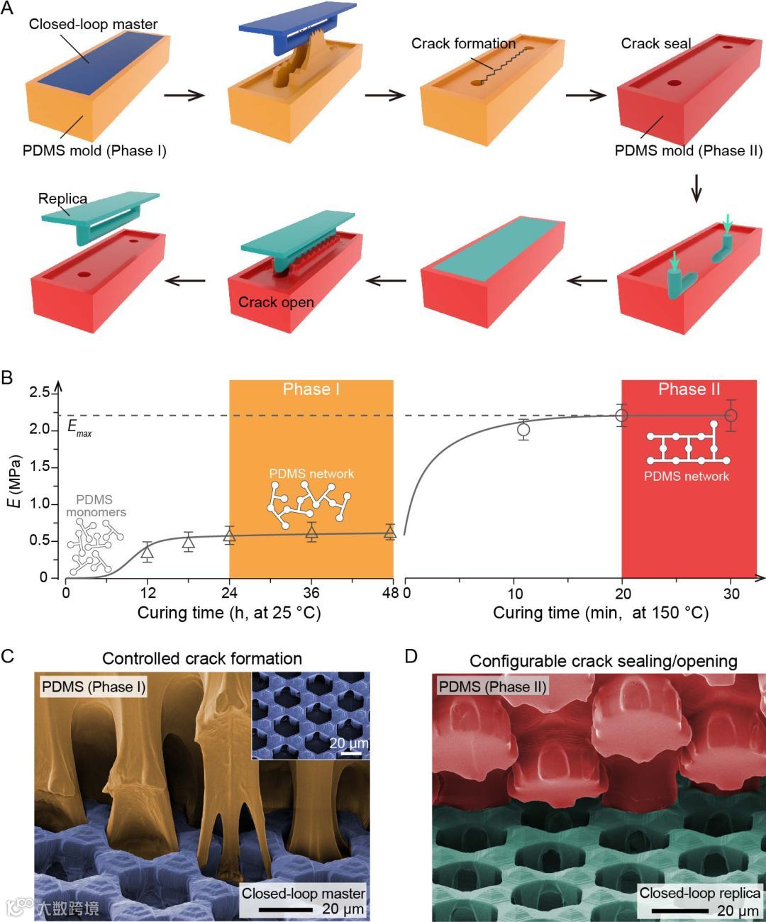 研究团队基于软光刻技术,研发了一种弹性裂缝工艺(elastic crack engineering)。与传统技术不同,该项工艺创造性的将铸模和模塑两个步骤与弹性体的两度聚合相结合,成功实现弹性裂缝的可控生产和可逆开合。以复制闭环结构为例,在铸模步骤,弹性体是在室温(25 °C)下固化,聚合度和机械强度很低。因此脱模过程中,模具发生极大形变,且裂缝倾向于沿闭环结构生成,以“解锁”模具;在模塑步骤,弹性体进一步在高温(150 °C)彻底聚合,具备相当的机械强度,因而能够在一定压力在仍旧保持裂缝闭合和形貌稳定,产品脱模时,裂缝又能再次打开,无损释放复制品。研究团队进一步做了对照试验,证实工艺采用的两步聚合法是不可替代的。如果第一步铸模是在高温下进行,过高的机械强度使得原始模板和弹性体模具完全锁死,导致裂缝完全失控,正如传统软光刻技术所呈现的结果;而如果模塑时未经高温烘焙,弹性体机械强度低,裂缝无法自愈,复制品中存在大量瑕疵。