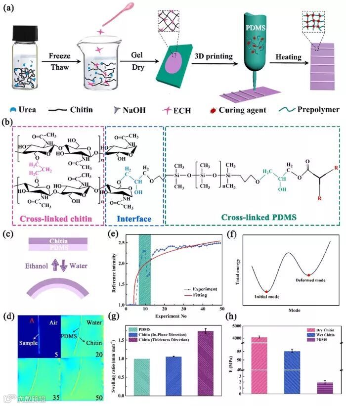 湿度响应变形在自然界中广泛存在,例如豆荚和小麦芒可以根据外界湿度变化实现自主的开闭。受到这些启发,研究者们创造了大量刺激响应水凝胶、弹性体和陶瓷材料,并应用在软体机器人、生物设备和组织工程等各个领域。在这些材料中,双层水凝胶系统由于其方便可调的特性受到广泛关注和研究。然而,由于水在水凝胶中的扩散速度较慢(10−10 to 10−9 m2 s−1)并且水凝胶的模量普遍较低(10~1000 KPa),导致了可变形水凝胶的响应和恢复时间都很长,同时难以得到复杂稳定的变形,这限制了可变形水凝胶在实际工程中的应用。因此需要一种方便快捷的方法来制造具有快速响应/恢复和稳定复杂变形的刺激响应水凝胶。