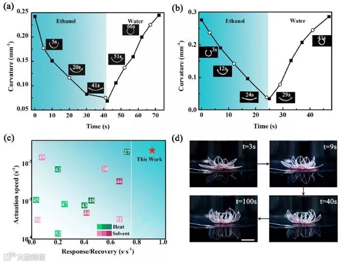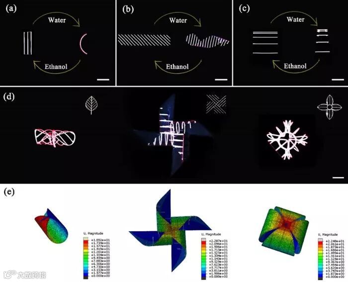 近日,香港城市大学吕坚教授课题组,在预应变驱动4D打印陶瓷前驱体之后(G. Liu, Y. Zhao, G. Wu, J. Lu, Sci. Adv. 2018, 4, eaat0641),与Kannie W. Y. Chan教授,香港理工大学胡金莲教授课题组合作,利用4D打印技术制备了可以在水/酒精溶液中实现快速、稳定、复杂且可逆变形的高分子条-膜结构。研究者利用高模量甲壳素膜作为驱动层,实现了稳定变形;设计条-膜结构增加水交换的接触面积,同时采用疏水低模量的PDMS作为限制层,达到了快速响应的目的。利用3D打印的超强定制性和设计性,制造树叶、风车、莲花和金鱼等一系列具有复杂变形的结构。该成果以题为“Direct‐Ink Written Shape‐Morphing Film with Rapid and Programmable Multimotion”发表在Advanced materials technologies 上。