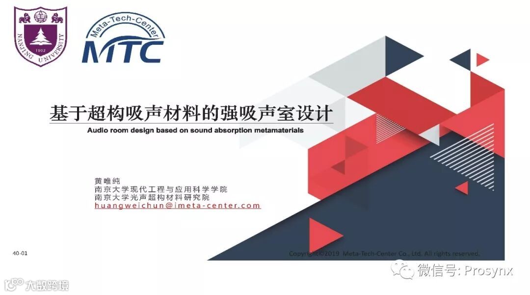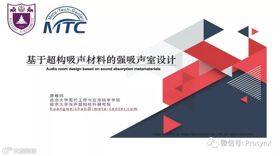 材料声学技术与产业化发展国际论坛(MATI 2019)南京大学现代工程与应用科学学院、南京大学光声超构材料研究院黄唯纯博士特邀报告(基于超构吸声材料的强吸声室设计,An Audio room design fully based on sound absorption metamaterials)。