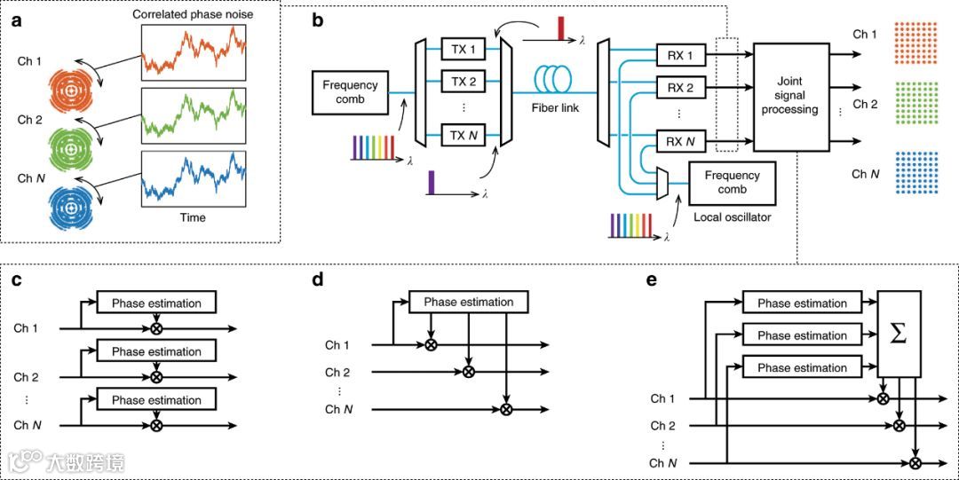 (a)传输系统中相关相位噪声重要性的说明。星系图被相同的相位噪声所扭曲,这使得联合相位处理成为可能。