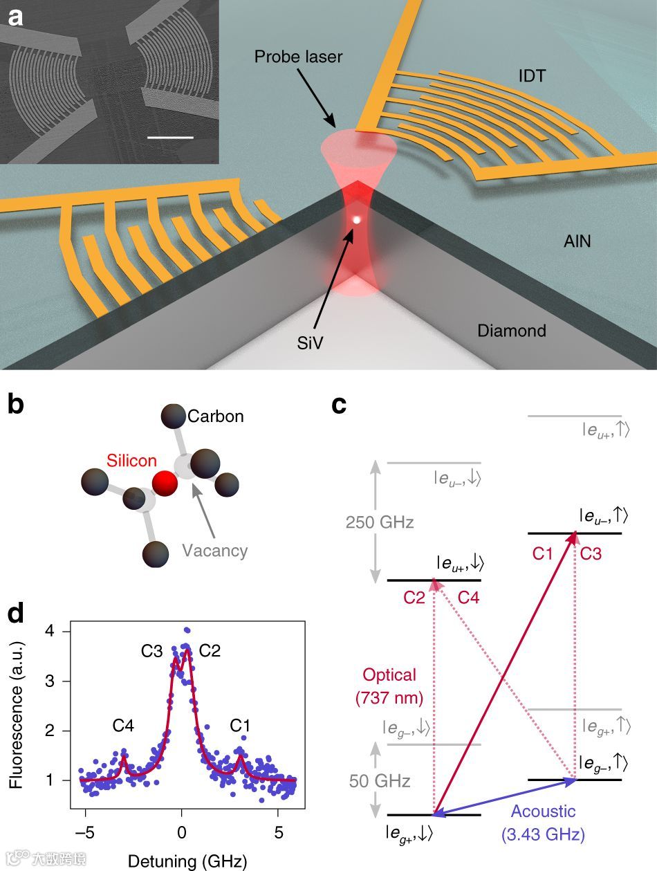 金刚石基表面波装置的示意图。(a)由于氮化铝(AlN)的压电响应,可以作为叉指换能器(IDTs),在微波信号作用下产生声波。用聚焦激光束探测金刚石中的siv。插图是一对传感器的扫描电子显微镜(SEM)图像。(b)SiV.分子结构。(c)非零外磁场下SiV的电子结构。实心红色箭头表示用于自旋初始化和读出的光学跃迁,虚线红色箭头表示其他光学跃迁。蓝色箭头表示自旋量子位的两个级别之间的声学转换。(d)共振光激发下SiV的C-跃迁的荧光光谱,显示出精细的结构。这四个峰对应于跃迁C1-C4。