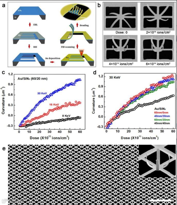 近几十年来,3D微/纳结构被广泛应用于微/纳机电领域、生物医学装置、能量存储等方面,在力学、光子学、生物学等领域展现出了极大的应用潜力。3D结构一个很有意义的应用之一是3D光学超材料领域。与2D相比,3D结构在电磁波的空间调制方面具有更大的自由度。3D折纸是一项著名的技术,它通过弯曲或者折叠二维纸张或薄膜从而形成宏观的3D复杂结构。受这一想法启发,在介观领域一系列折纸技术都被广泛地开发研究,如利用压缩拉伸、应力失配甚至毛细现象、细胞牵引等引起的弯曲,构建出精致的3D结构。