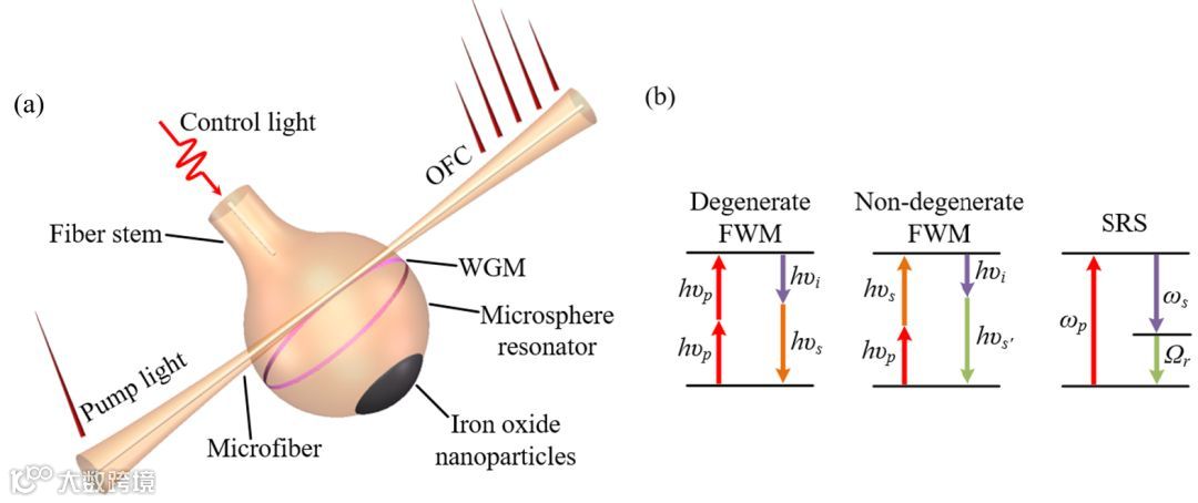 图1 (a) 功能化的氧化硅微球腔示意图;(b) 四波混频和受激拉曼散射原理图。