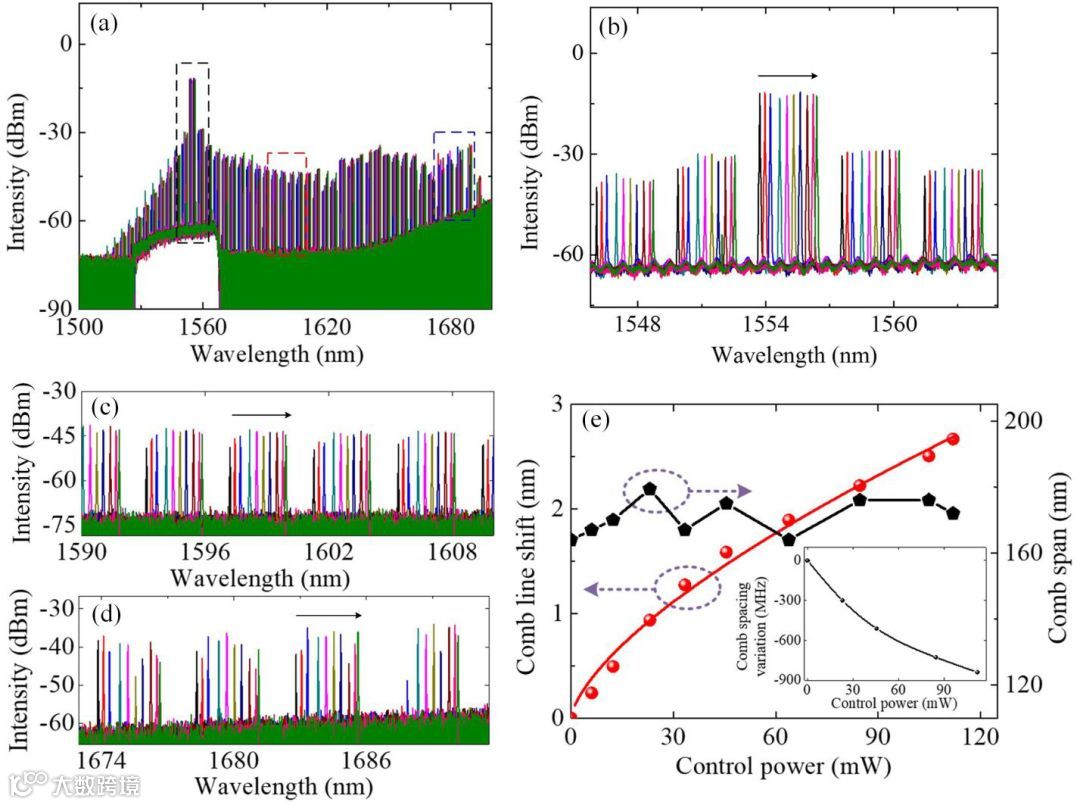 图4 (a) 拉曼-克尔光频梳的梳齿调控性能;(b-d) 梳齿调控性能放大图;(e) 梳齿调谐范围和光频梳带宽随控制功率的变化,插图是梳齿间隔随控制功率的变化。