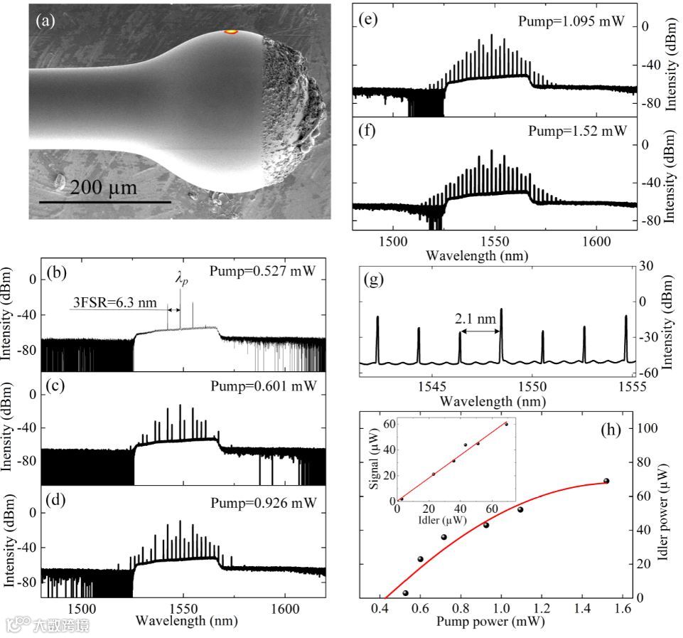 图2 (a) 功能化微球腔的SEM;(b-f) 克尔光频梳的产生(微腔直径248 μm);(g)光频梳放大图;(h) 闲频光功率随泵浦光功率的变化,插图是信号光功率与闲频光功率之间的关系。