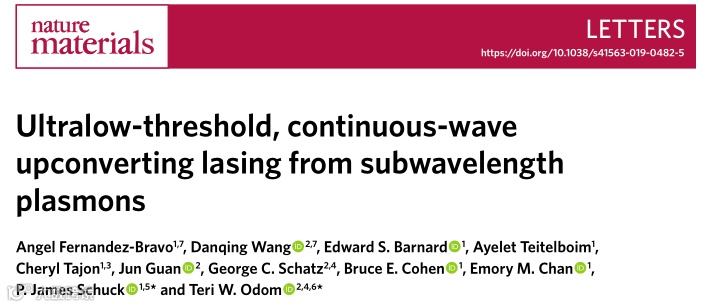 近日,来自美国西北大学、哥伦比亚大学以及劳伦斯伯克利国家实验室等的研究团队设计了一种亚波长表面等离激元纳米激光器,集成两项关键技术,成功增强纳米腔与镧系离子(Ln3+)发射器之间的耦合,降低上转换激光阈值,显著提高了设备稳定性。这种低阈值上转换纳米激光器在近红外泵浦下连续工作6小时后,仍能以一定频率提供定向、超稳定的输出,这为之前无法实现的相干纳米光应用提供了新的发展前景,为集成紧凑、低功耗电路以及体内应用(包括深部组织成像、传感)提供了更多的可能性。本研究工作以Ultralow-threshold, continuous-wave upconverting lasing from subwavelength plasmons为题发表在《Nature Materials》上。