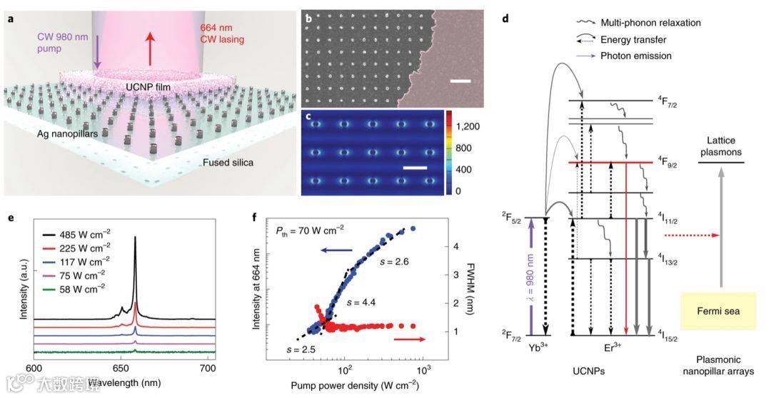 本实验设计了一种亚波长等离子体纳米激光器,集成了两项关键技术,成功增强纳米腔与镧系离子(Ln3+)发射器之间的耦合,降低上转换激光阈值,显著提高了设备稳定性。首先,研究人员制备银纳米阵列,其晶格等离子体的共振与掺杂敏化剂Yb3+离子/发射极Er3+离子的胶体UCNP中的红色Er3+上转换发射跃迁重叠(图1a-c)。然后,继续开发了具有高Ln3+含量的核壳结构的UCNP,与标准组分相比,它具有更好的发光性能和更低的饱和强度。在全固态系统环境下,980nm的近红外泵浦可以激发UCNP中的Yb3+离子,从而将能量转移到Er3+离子,以促进多个可见光段和近红外波段的上转换发射,而晶格等离子体子模式可以被设计为选择性耦合Er3+发射(红色)(图1d)。最后,本实验实现了在室温下进行的连续上转换等离子体纳米激光,在连续和脉冲泵浦条件下都能实现连续发射,实验的时域半量子模型捕捉到了特征粒子数反转和强光学非线性;即使在长时间工作(>6h),该激光器仍能发射非常稳定的激光,其激光阈值低至29Wcm-2,明显低于其他等离子体上转换纳米激光器。总的来说,这种具有近红外泵浦的低阈值上转换纳米激光器为集成紧凑、低功耗电路以及体内应用(包括深部组织成像、传感和光基因操作)提供了更多的可能性,本研究工作提供的全固态纳米激光平台为实现量子光学技术和商用片上光子器件提供了广阔的发展前景。