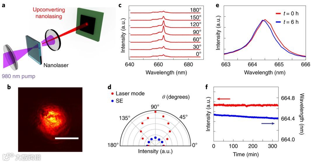 e,f,连续照射6 h过程中激光光谱、强度和波长(红色和蓝色曲线)的稳定性,图象表现出了稳定的发射强度和适度的模式漂移(<0.15 nm)。