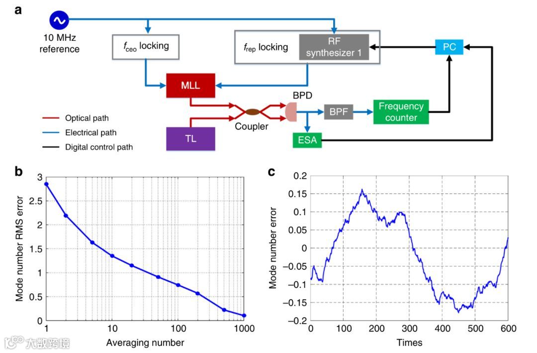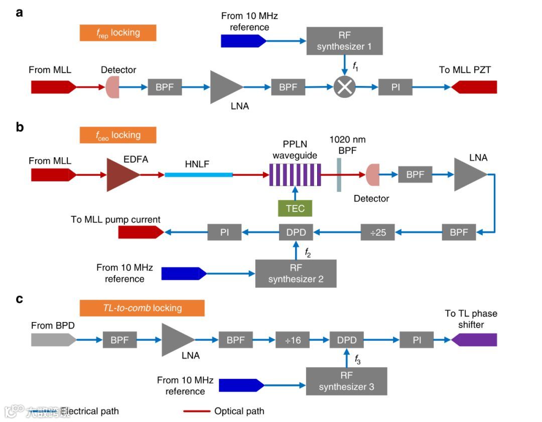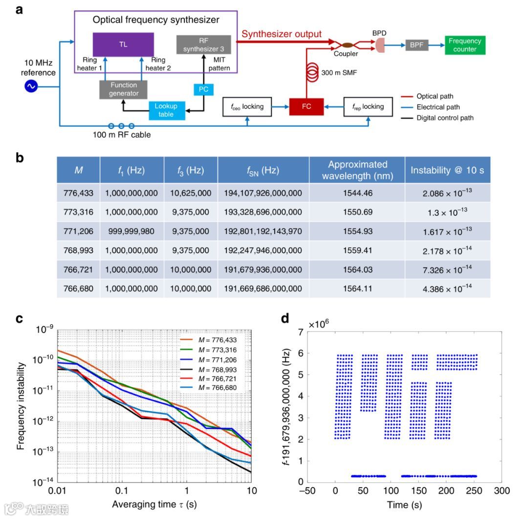 文章展示了一种基于集成铒可调谐激光器的光学频率合成器,该合成器可以通过调节内部锁模激光器的重复频率进行自校准。可以达到从1544nm到1564nm跨度20nm的调谐范围,同时在10秒时间内频率不稳定性低至10-13。