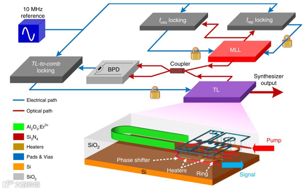 图1 上:光学合成器架构 下:可调激光器原理