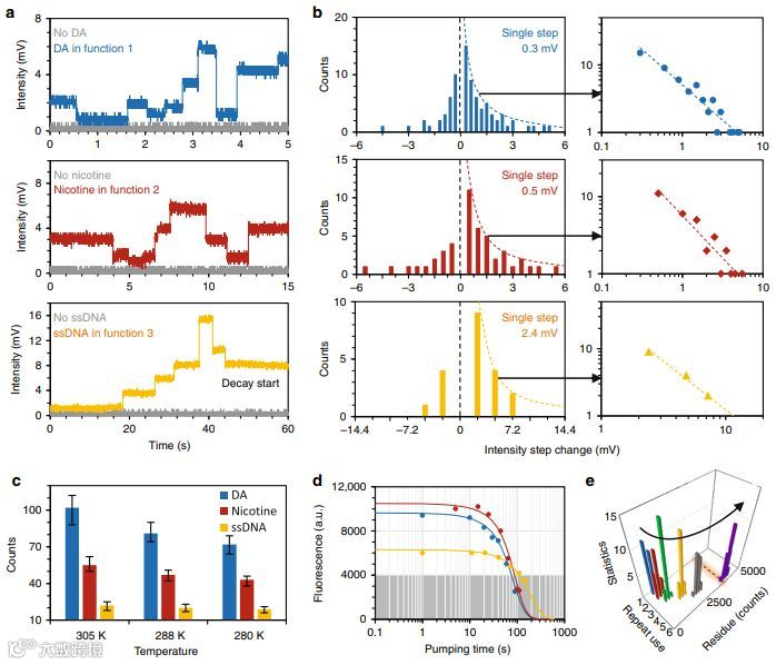 图3(a)具有不同功能的传感器分别应用于多巴胺、尼古丁和单链DNA。(b)对于不同目标分子的传感器的传感性能。