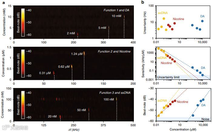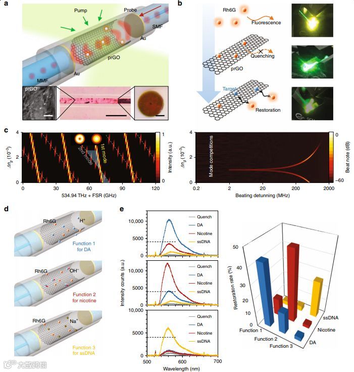 研究人员通过在毛细管准直的微流控染料谐振器上沉积部分还原的氧化石墨烯(prGO)从而构成光子生物传感器。功能化的prGO仅与特定的目标分子相互作用,从而为荧光共振能量转移(FRET)提供化学选择性,进而为模间干扰提供光学增益。 prGO上的分子相互作用还引起纵向传输模式之间的光谱移位,从而使高精度光电外差干涉测量法和消除噪声的锁定放大系统中的单个分子能够感应。在实验中,研究人员用三种类型的功能性共振分子研究了基本的生化目标,多巴胺(一种典型的神经递质),尼古丁(一种典型的生物碱)和ssDNA(脱氧核糖核酸,一种具有丰富氨基的长链遗传物质)。这三个物种都具有相对较大的键合能,可以在prGO中进行染料-靶标交换。