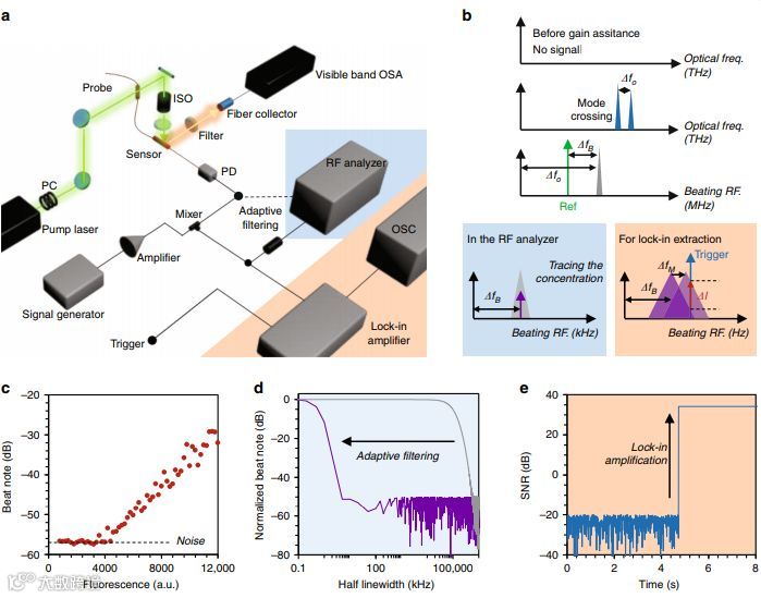 图 2 (a)实验装置示意图。(b)利用拍频检测部分还原氧化石墨烯中的选择性FRET。(c)RF信号测量。(d)频率响应波特图。(e)利用锁相放大器增强信噪比。