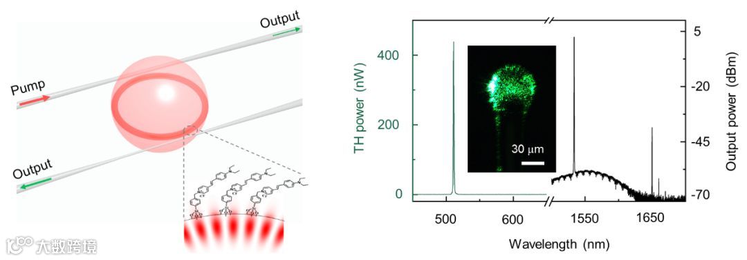 左图:二氧化硅微腔表面修饰有机共轭分子;右图:实验测得的激发光和三次谐波光谱图。