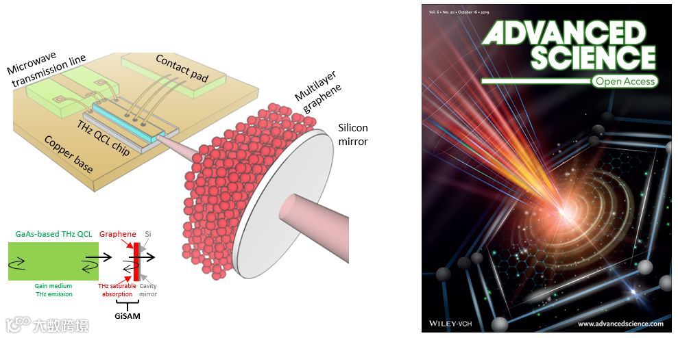 THz QCL被动光频梳器件示意图(左)和Advanced Science期刊论文封面(右)