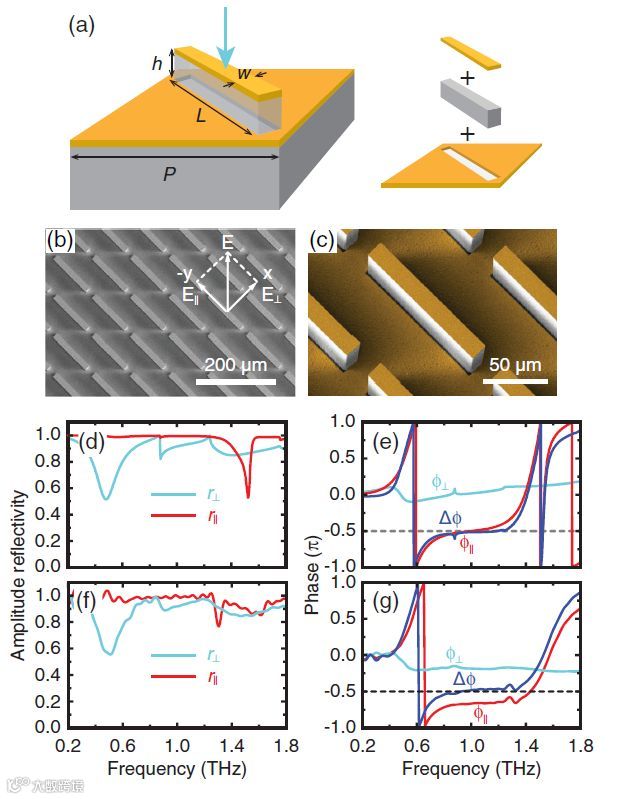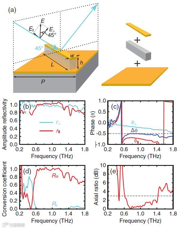 偏振态是光的固有特性之一,圆偏振光具有广泛的应用,例如圆二色性光谱,光磁记录,传感,材料表征和无线通信。典型的相干光源是线性偏振的,因此线性到圆偏振转换是生成圆偏振光的实用方法。基于单个双折射材料板的波片能够实现窄带的线性到圆偏振转换,堆叠具有精心安排的厚度和方向的多个双折射板可以扩大操作带宽,但是设计和制造变得更加复杂。尽管可以通过在菲涅耳菱形棱镜等棱镜中使用全内反射来实现消色差偏振转换,但庞大的尺寸使其难以在光学系统中小型化和集成。这些问题对圆偏振态的宽带调制提出了进一步的挑战,特别是在太赫兹(THz)频率下,光学领域中常规使用的光弹性调制器是不可行的,因为不断增加的波长需要光弹性材料的过高的机电驱动,以在两个正交线性极化之间引起足够大的双折射和相位延迟。