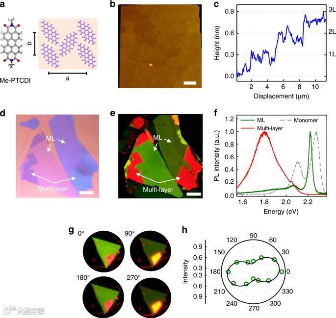 最近,南京大学电子科学与工程学院王欣然教授、化学化工学院马海波副教授和美国加利福尼亚大学伯克利分校Ali Javey教授合作,开发了一种基于蒸汽运输的方法来精确地组装二维表面上的分子,这为研究分子的电学和光学特性提供了可能。在这项工作中,他们研究单层(ML)二萘嵌苯衍生物的光学特性,其分子的堆积可产生强偶极相互作用,而电子耦合较弱, 这是长距离J-聚体的理想条件。他们发现激子具有巨大的振荡强度,导致强吸收(室温和4K下分别超过15%和30%)和亮发射(比半导体TMDs大两个数量级以上)。结合温度依赖实验和密度泛函理论(DFT)计算,他们发现,激子波函数(Nc)的尺寸逐渐增大,在低温下可以达到百分子量级,这与无机半导体中的Wannier激子相似。进一步,他们在ML-perylene衍生物上制作了瞬态发光器件,并证明了激子态在电激励下是鲁棒性的。他们观测到近100%的光致发光量子产量(PLQY)、小于30 ps的辐射寿命和电注入,为相干偶极相互作用的高效率、高速发光器件铺平了道路。相关工作发表在《Nature Communications》上。(短文作者:方轲)