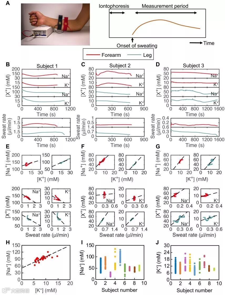 (A)显示离子电渗汗液提取和离子电渗汗液电解质和汗液率的区域分析的示意图。传感器佩戴在前臂和腿上,以测量(B),(C)和(D)中三个检测对象的动态[Na + ],[K + ]和出汗率曲线。电解质浓度和出汗率的比较显示三个检测对象中的两个具有强烈的正相关性,而[Na + ]与(E至G)中的所有检测对象的[K + ] 强烈相关。(H)收集的离子电渗疗法汗液样本的离体分析证实了[Na + ]和[K + ]之间的强关系。(I)多个受试者的[Na + ]范围的比较和这些检测对象的(J)[K + ]范围表明,当在整个群体中进行比较时,具有较高钠水平的检测对象通常具有较低的钾水平。